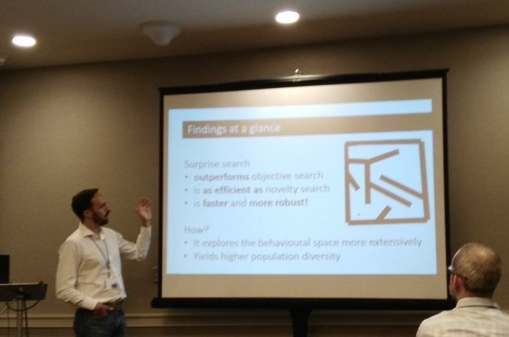IDG member Georgios N. Yannakakis just attended the Genetic and Evolutionary Computation Conference in Colorado, presenting original work from the Institute of Digital Games on evolutionary divergent search. The paper presented by Georgios is titled Surprise Search: Beyond Objectives and Novelty and introduces a new algorithm for Artificial Intelligence, which attempts to optimize the unexpectedness of the agents' behavior from one generation to the next. This work, funded by the AutoGameDesign project, has been carried out by Daniele Gravina and tests Surprise Search in a maze navigation task. The robots must learn to navigate a maze with dead-ends and deceptive pathways, with the goal of producing behaviors not expected based on their recent historical trends. Find more about surprise search here!