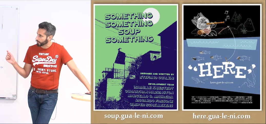 Prof. Gualeni also refers to his playable philosophy work with strong ties to language games philosophy such as Something Something Soup Something a game based on Wittgenstein's ideas of language and HERE which deals with the concept of indexicality. The players are challenged to engage with- (and be puzzled by-) what it means when the word “here” is used in a computer game... Or, rather, how many meanings of “here” can co-exist in a computer world. The game features cameos by award-winning Interactive Fiction writer Emily Short and IDG lecturer and award-winning game designer extraordinaire Pippin Barr.