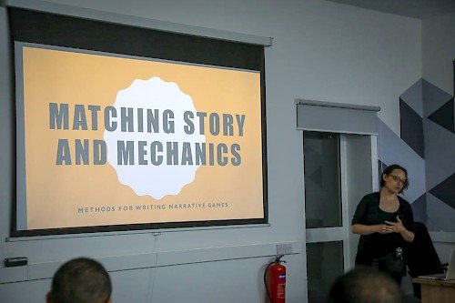 He was followed by Emily Short, who presented "Matching Story and Mechanics" where she surveyed brainstorming techniques and common design moves to bring game and story concepts together quickly.