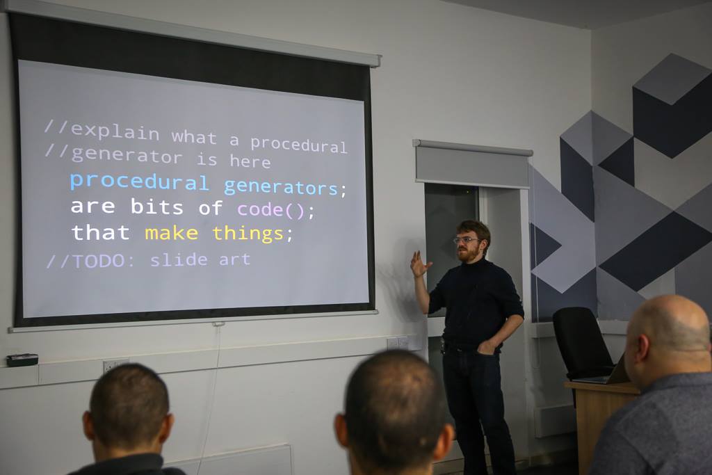 Mike Cook was the first keynote speaker and he presented "Make Your Game Jam Smarter, Healthier And Weirder With Procedural Generation", where he explained how to use templates to make your work as a game designer more interesting and less stressful.