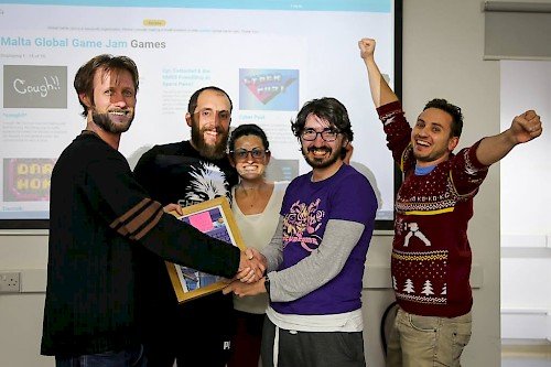 After trying them all out the jamers had the opportunity to vote for their favorite game on the night. The winners take home the coveted "Winner of the Popular Vote" prize, a modified version of the Malta Global Game Jam poster. This year the prize included an authentic sample of IDG Lecturer Antonios Liapis's handwriting. The winning team also included to IDG Alumni: William Cachia and Jean-Luc Portelli.