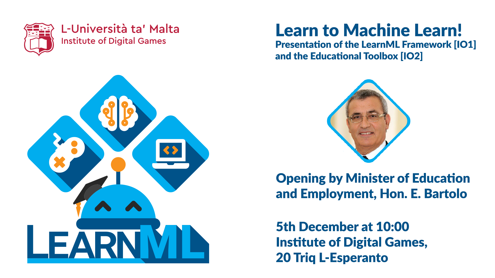 The Institute of Digital Games organizes the first multiplier event of the (LearnML) project on the 5th of December with an opening address by the Minister of Education and Employment, Hon. E. Bartolo and the Rector of the University of Malta, Prof. A. Vella. A number of internationally established researchers and educators from Malta, Norway and Greece will also talk about game-based learning, computational thinking, ethics of AI, and the didactics of AI training in primary and secondary education. Guests will also have the opportunity to try out the games that form the basis of the project and connect with the researchers.