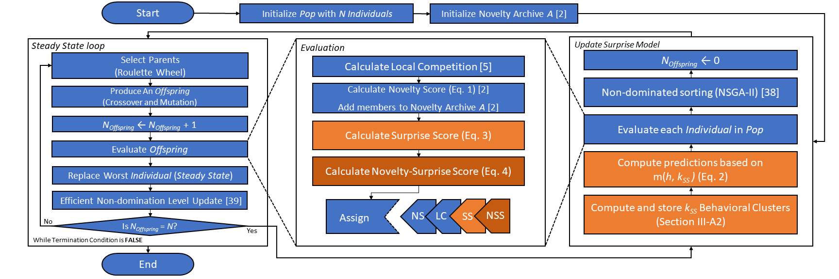 The paper, “Quality Diversity Through Surprise,” investigates the use of surprise as a mechanism of search finding that it turns out to be highly beneficial for the efficiency and robustness of quality diversity (QD) algorithms. The surprise-based QD algorithms introduced in this IEEE TEC paper were tested thoroughly across several procedurally generated maze navigation tasks. Overall our findings suggest that if surprise and novelty operate synergistically for divergence they yield quality diversity algorithms of improved efficiency, speed and robustness. The source code and more information about surprise search can be found on the AutoGame website.