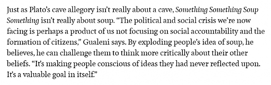 Addressing the practical involvement with design, Gualeni is presented in the article as “not your grandmother’s intellectual”: “he produces papers, gives lectures and mentors students, but he also builds things”. His is indeed a particular, and particularly practical (and playful) way to deal with philosophical ideas such as personal identity, the precise definition of things, the confusing nature of indexicals, the blurred boundaries between the actual and the virtual, and so on…