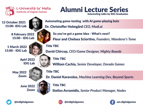 We have always held monthly guest lectures that have been open to the general public, where visiting academics such as Prof. Julian Togelius of NYU or industry speakers such as Coline Panier formerly of Ubisoft. Sometimes, it is an opportunity to present our own work to the Maltese videogames and academic community, such as was done by Dr Daniel Vella or Prof. Yannakakis.