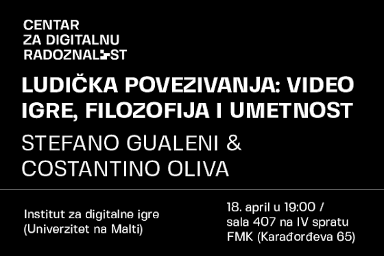 >> APRIL 18: As a Tag-team, Prof. Stefano Gualeni and Dr. Costantino Oliva were invited to present their work in a game studies in a panel organized by FMK (Faculty of Media and Communication). More specifically, Stefano will talk about the conceptual use of games, and Costantino on the theme of ludomusicology. The event is free, and will take place at FMK (Karađorđeva 65, room 407) starting at 19.00.